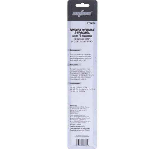 Набор торцевых головок Е-профиль 910614 Ombra применяется с гайковертами. Головки в наборе различаются по диаметру и хвостовику, что обеспечивает удобство его использования. Выполняя монтажную работу с крепежом, необходимый по размеру инструмент легко найти в наборе. Оснастка используется для откручивания крепежа с профилем EXTERNAL TORX (Е). Торцевые головки подходят для ударных нагрузок и обладают лучшим крутящим моментом по отношению к резьбе, чем другой подобный инструмент. Материал оснастки хром-ванадиевая сталь, что обеспечивает ее высокую прочность и стойкость к нагрузкам и механическим воздействиям. Еще одной особенностью торцевой головки является хромоникелевое покрытие, за счет которого с поверхности оснастки легко удаляются все видимые загрязнения и она не подвергается коррозии.